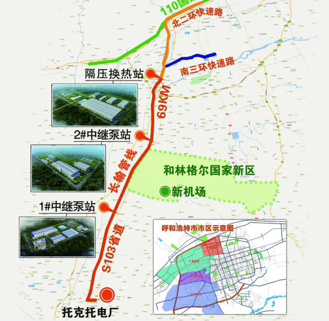 托克托電廠至呼和浩特長輸供熱管網(wǎng)工程示意圖
